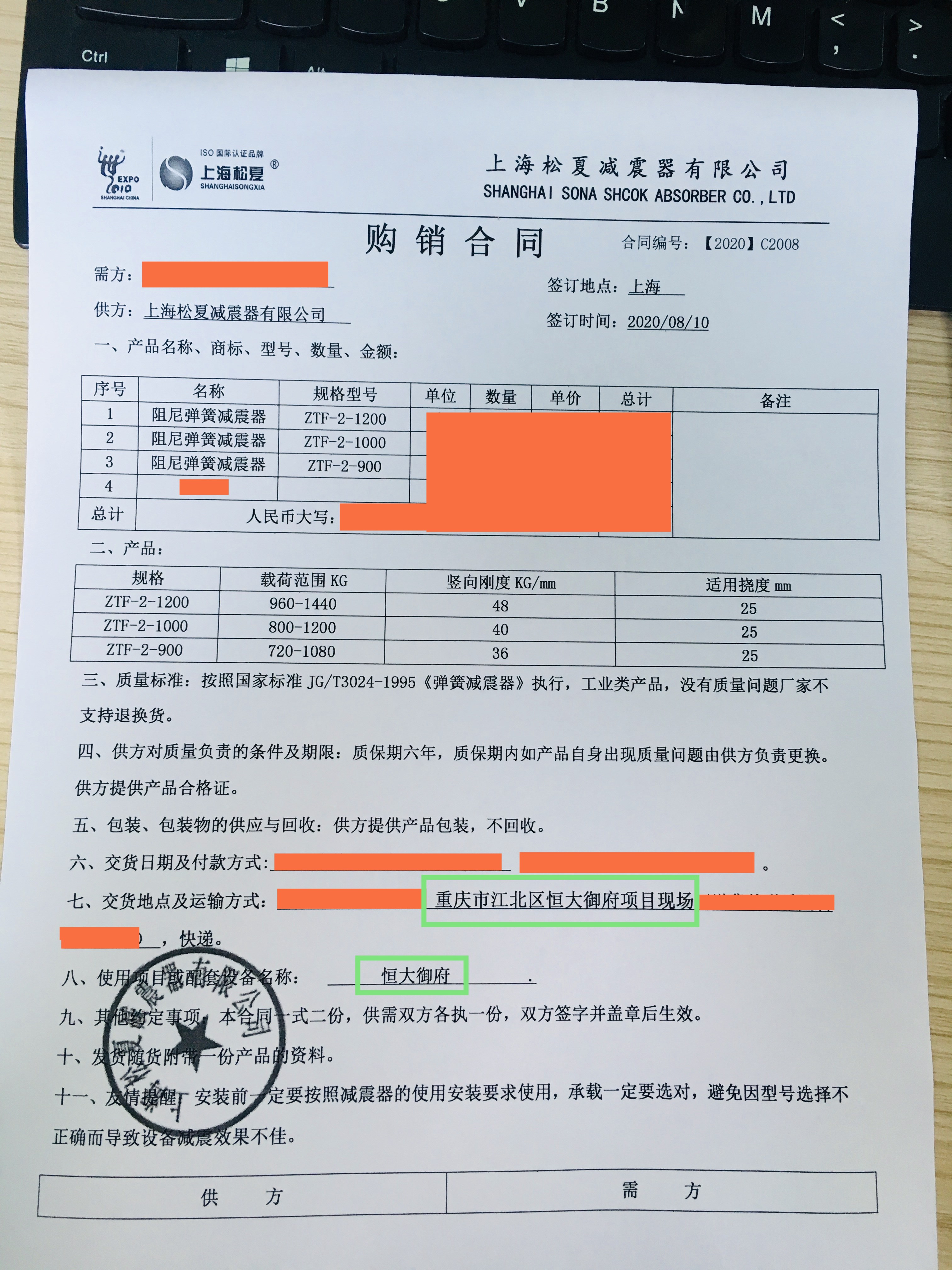 上海松夏減震器有限公司官方網(wǎng)站為您介紹:【恒大御府配套】上海松夏阻尼彈簧減震器采購合同信息,我們松夏公司2020年為【恒大御府配套】上海松夏阻尼彈簧減震器,起到了減震和降噪的作用,以下是【恒大御府配套】上海松夏阻尼彈簧減震器采購合同介紹。